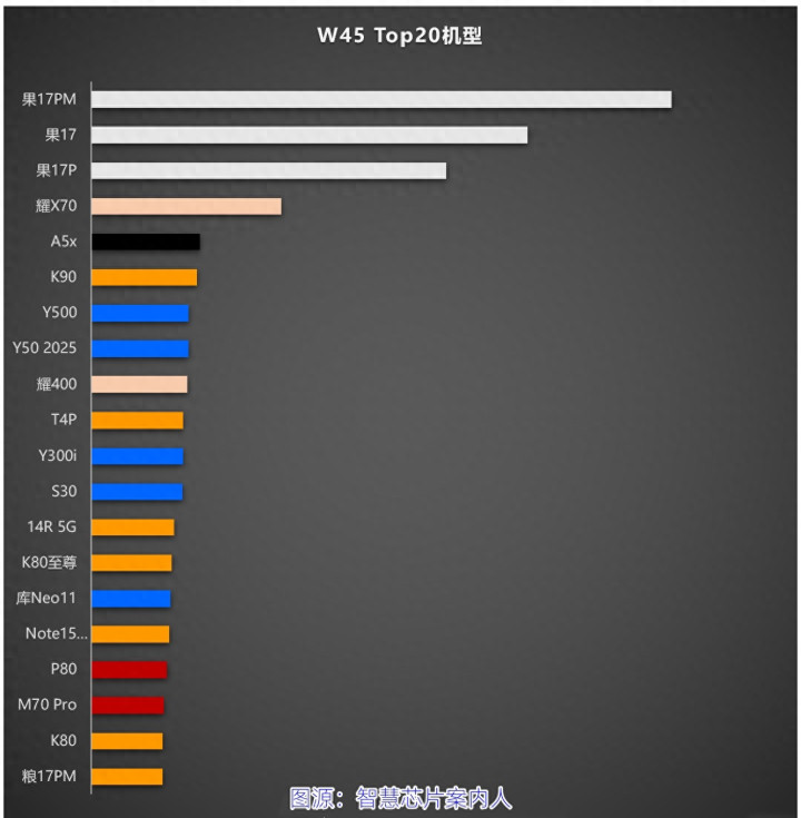 今天分享的是W45(11.3-11.9)国内智能手机畅销榜,数据来源是知名数码博主智慧芯片案内人,进入畅销榜TOP20的手机厂商共有6个。从排行和数据来看,iPhone17系列依旧遥遥领先,榜单中的国产新机仅有3款。剩下的14款机型发布时间均早于2025年9月份,并且绝大部分均为中低端机型,目前到手价不超过2000元,以下是榜单的详细内容。
