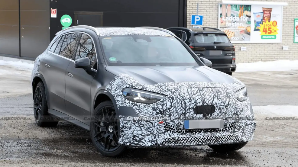 3月27日消息,奔驰正在开发AMG版本GLC EQ,定位高于现有GLC 400 4Matic。测试车采用哑光黑涂装,配备更运动化前保险杠、调整后的进气设计及全新格栅,黑色轮毂搭配打孔刹车盘与大尺寸卡钳。